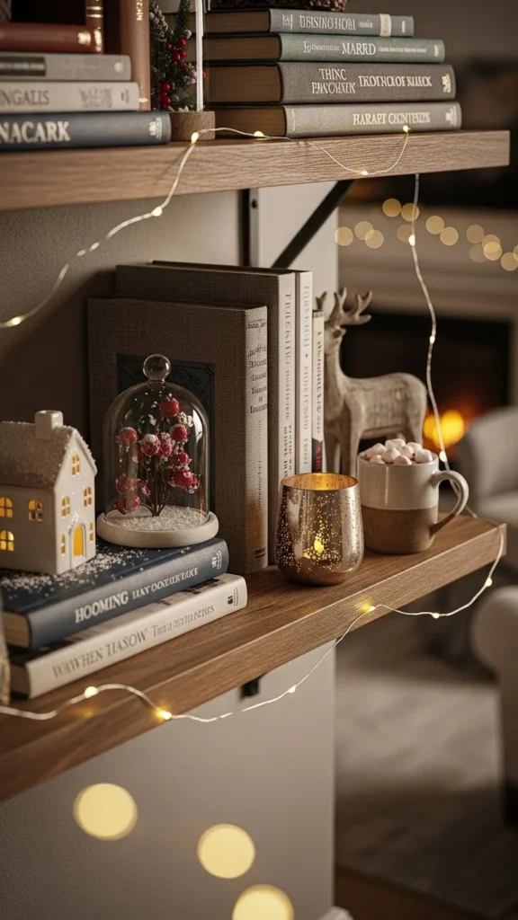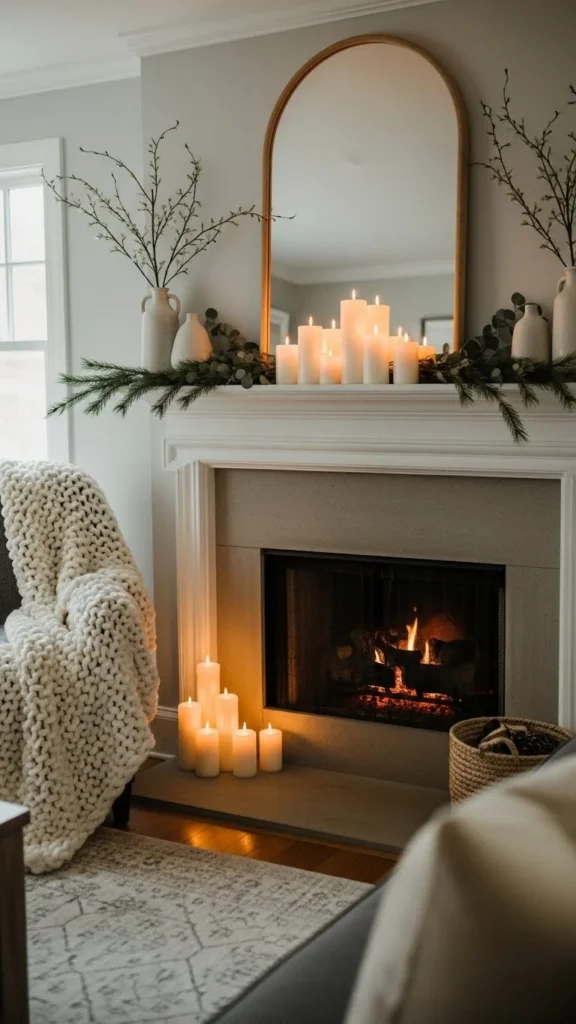 A fireplace draws attention in winter. Keep the mantel simple and calm. Candles, small framed photos, or ceramic pieces work well. Stick to a limited color palette.