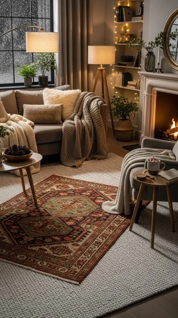 Cold floors can make a room feel uninviting. Layering rugs solves that quickly. Start with a simple base rug in a neutral shade. Place a smaller rug on top with light texture or subtle pattern. This adds warmth and visual depth without changing furniture.