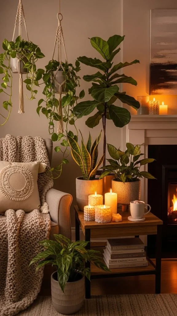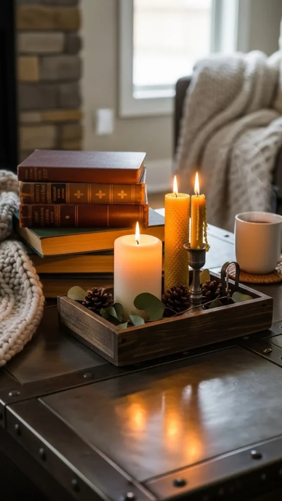 Wooden trays or woven baskets add texture without clutter. Candles in glass or ceramic holders bring gentle light during evenings. Avoid strong scents if the room is small.