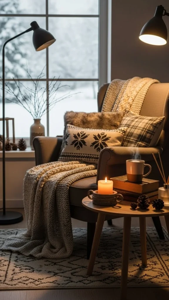 Overhead lights can feel stark during winter evenings. Table and floor lamps create a softer glow. Use warm bulbs that cast gentle light rather than bright white. This simple switch changes the mood fast.