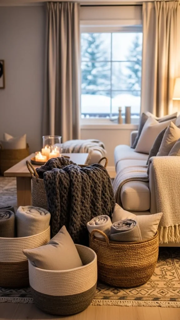 Blankets stored away don’t get used. Place them in woven baskets near seating areas. It’s practical and decorative.