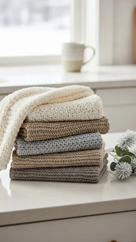 Swapping everyday dish towels is one of the easiest winter updates. Choose knit or waffle textures in soft colors like cream, gray, or pale blue. Texture adds warmth without clutter.