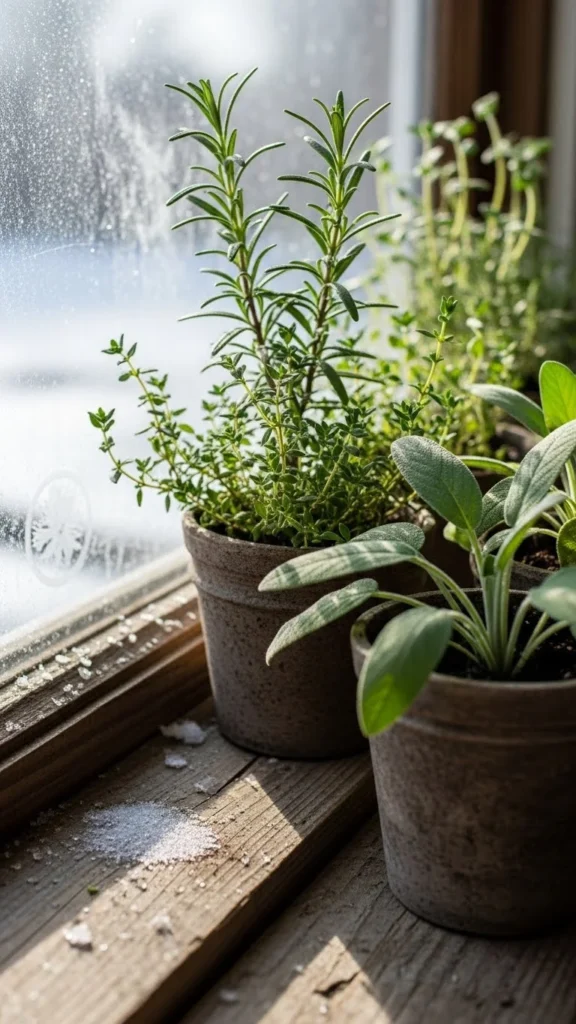 Herbs bring life into winter kitchens. Choose rosemary or thyme since they hold up well indoors.