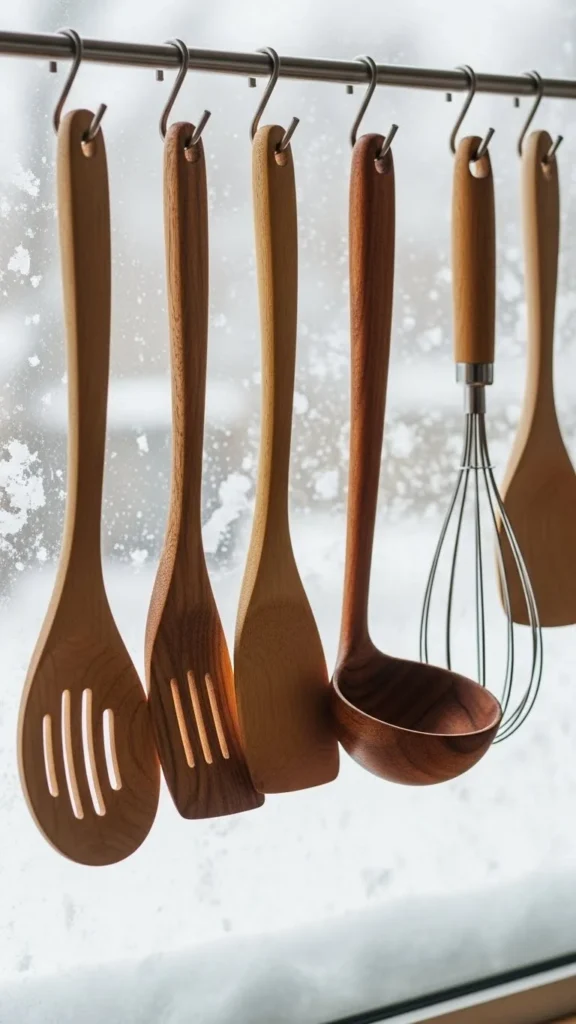 Wooden utensils look decorative when hung neatly. Use a simple rail or hooks.