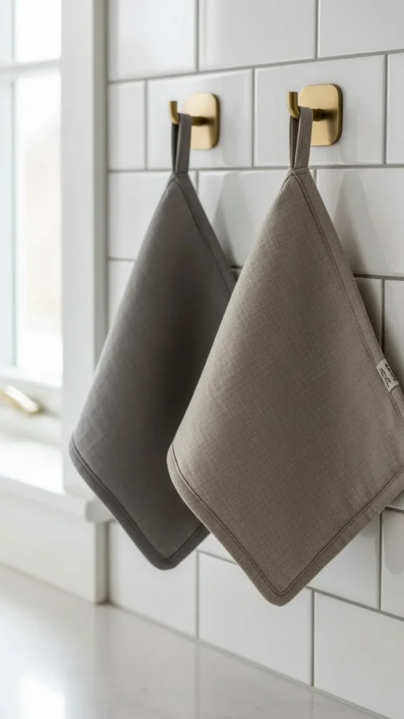 Fold towels neatly and drape one over the oven handle. Stack extras in a small basket near the sink. This keeps them useful and decorative at the same time.