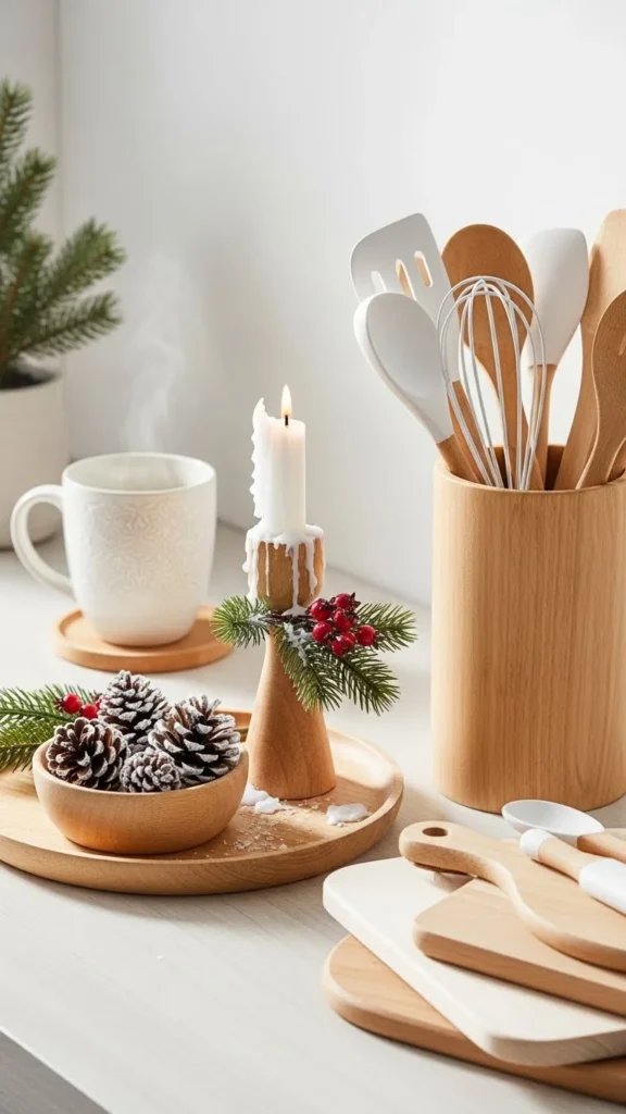 Wood spoons, bowls, or trays add warmth. Place them where they feel natural.