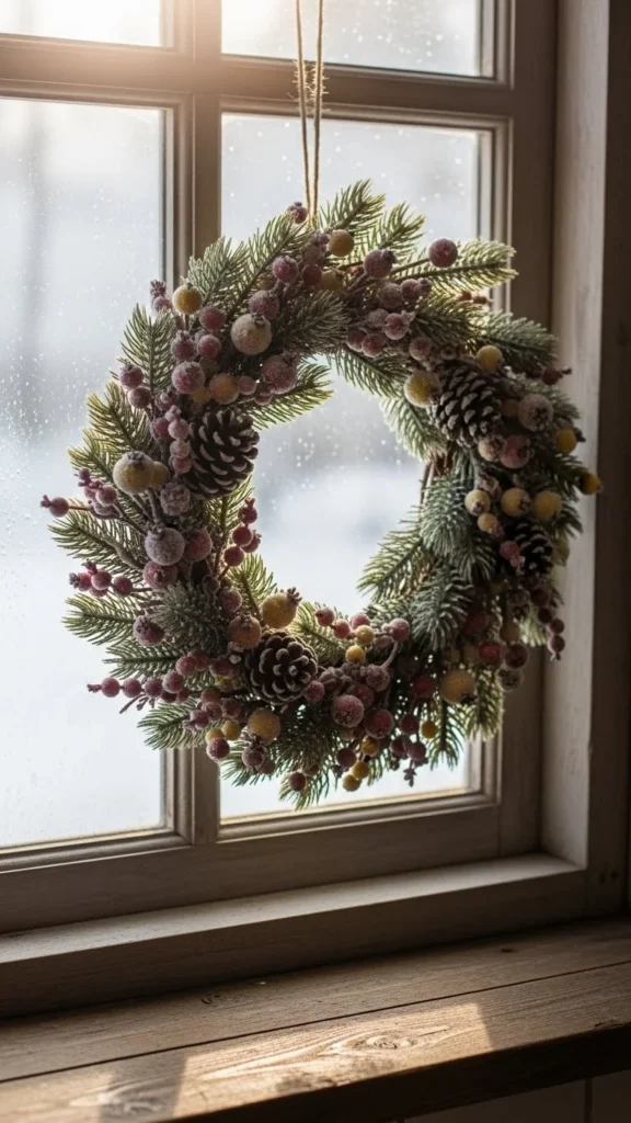 A small wreath adds charm without crowding. Use faux greenery or fabric loops.