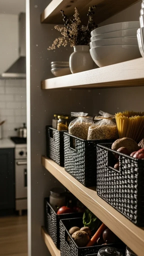 Baskets hide clutter while adding texture. Choose matching styles.