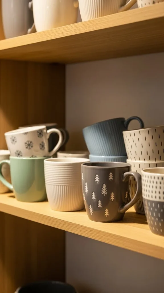Winter mugs feel comforting even when not in use. Display a small group on an open shelf or mug tree. Stick to similar colors for a tidy look.