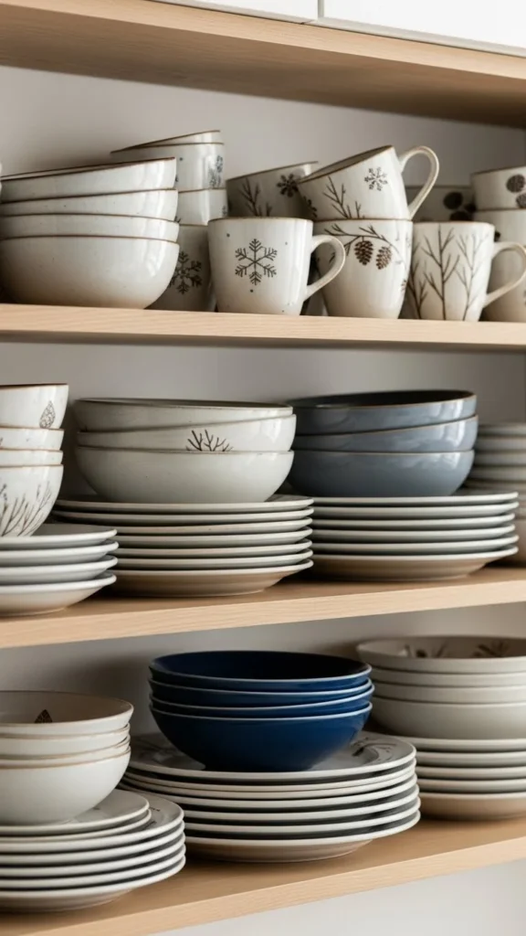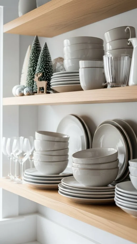 Open shelves offer an easy styling spot. Mix everyday dishes with small winter accents like greenery or ceramic pieces.