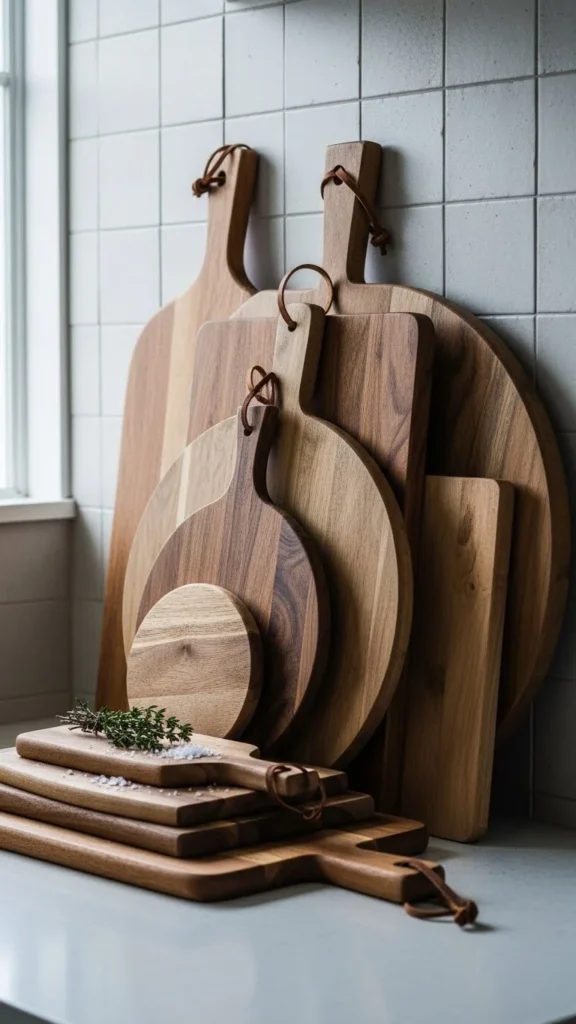 This idea costs nothing if you already own boards. When cooking, grab one and put it back after. It’s decor that stays practical.