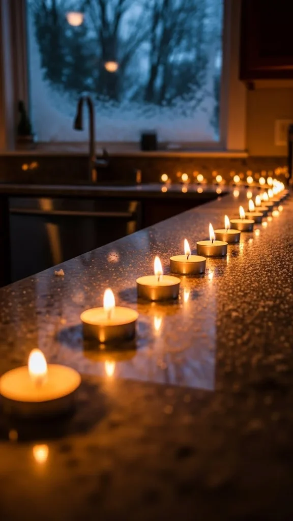 Battery candles work well near food prep areas. Choose warm tones for a calm glow.