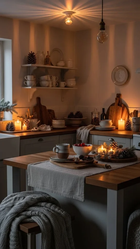 Candles in the kitchen feel cozy during darker afternoons. Use small jars or ceramic holders. Place them away from splashes or heat.