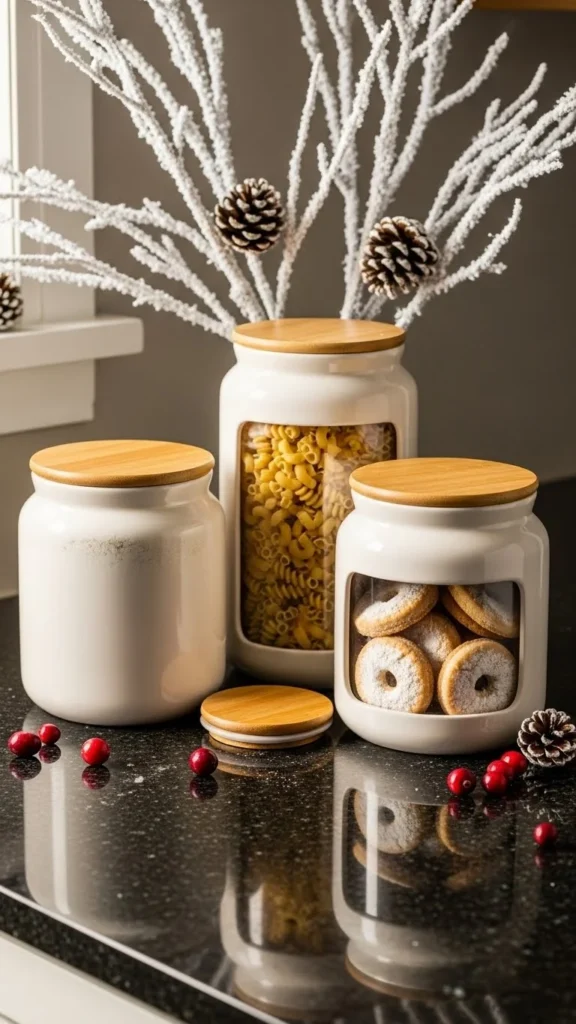 Ceramic jars hold utensils, sugar, or snacks while adding charm. Choose neutral or pastel tones for winter.