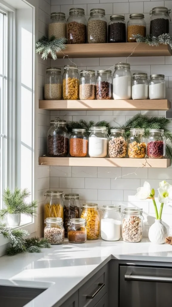 Clear jars filled with oats, pasta, or beans add visual interest. The textures show beautifully in winter light.