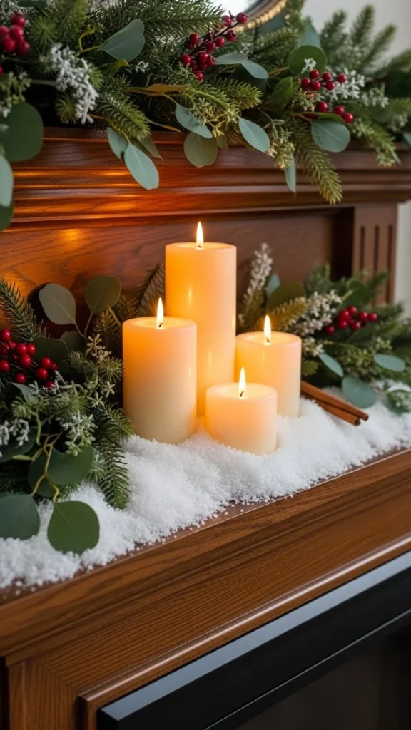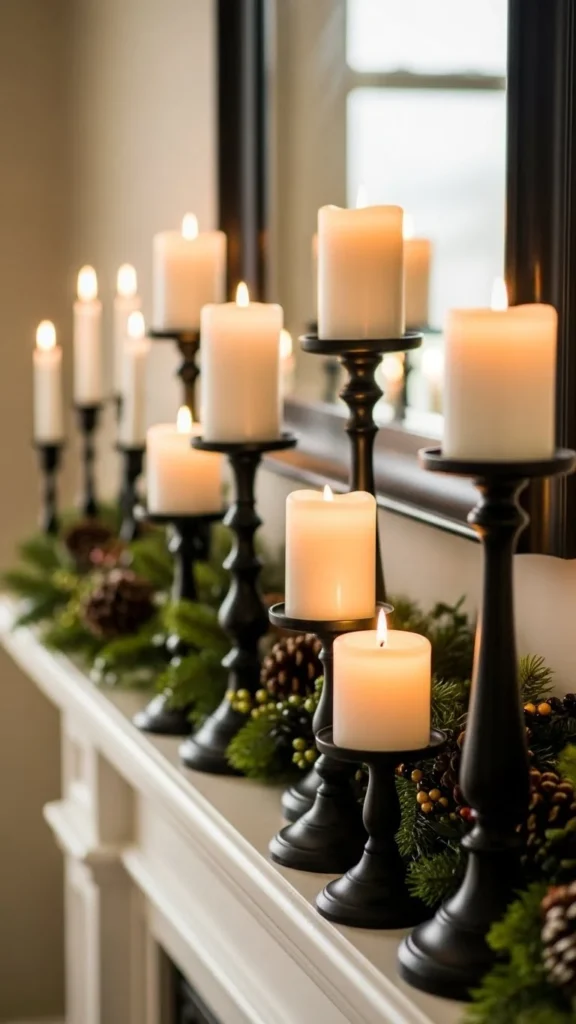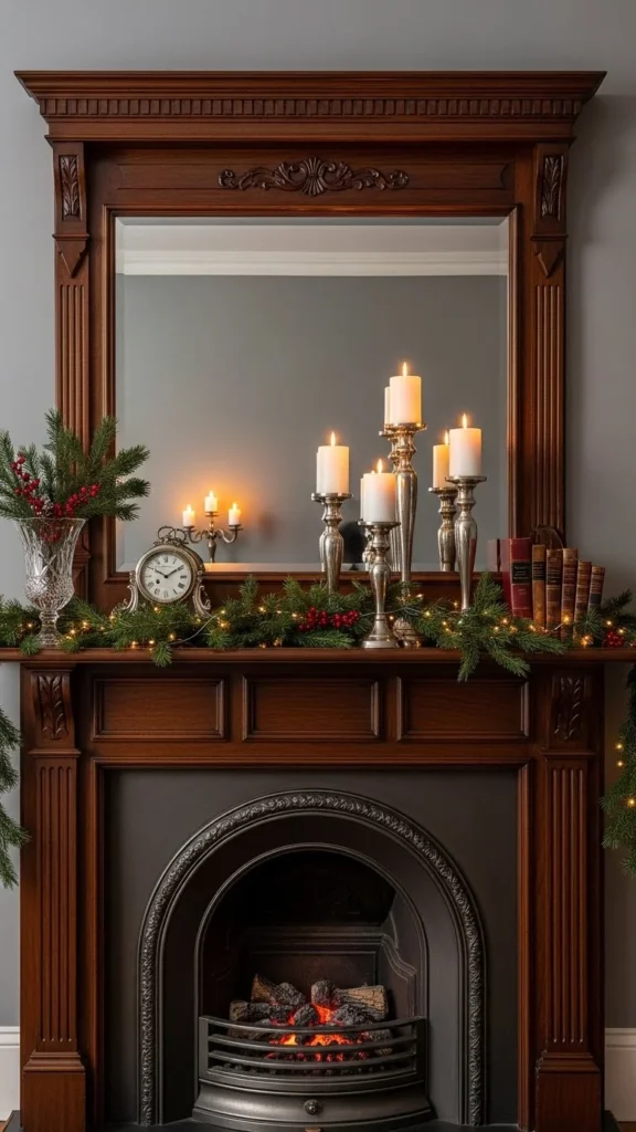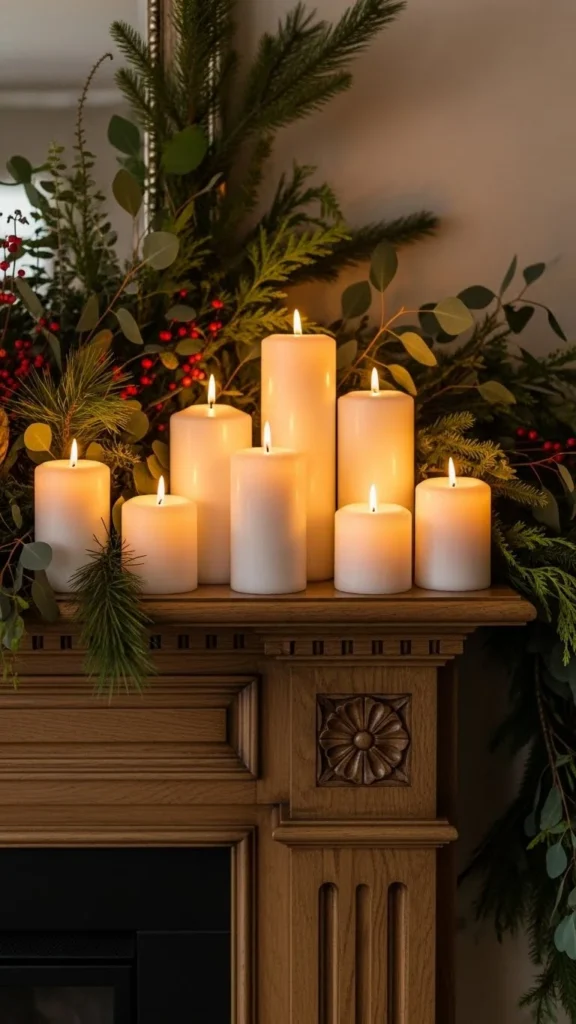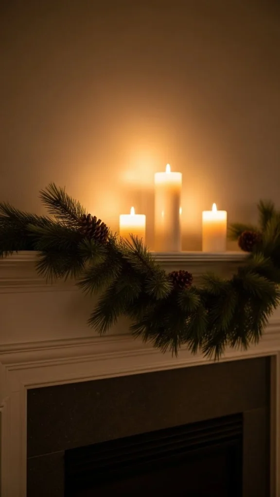 A mirror above the mantel reflects candlelight and tree lights at night. This doubles the glow without adding more decor.
