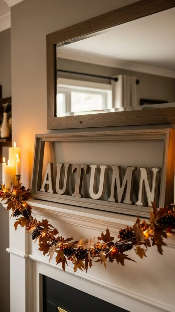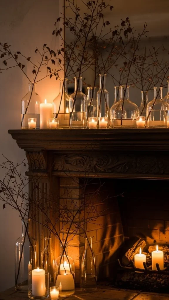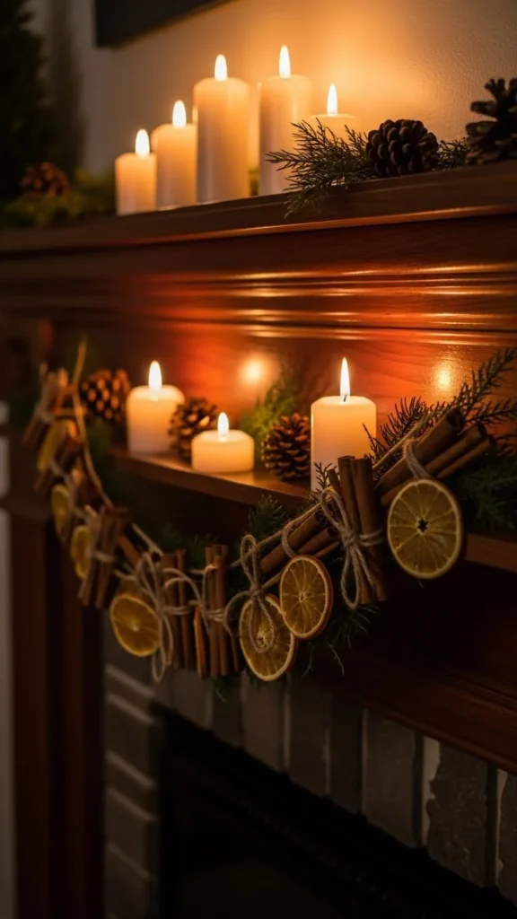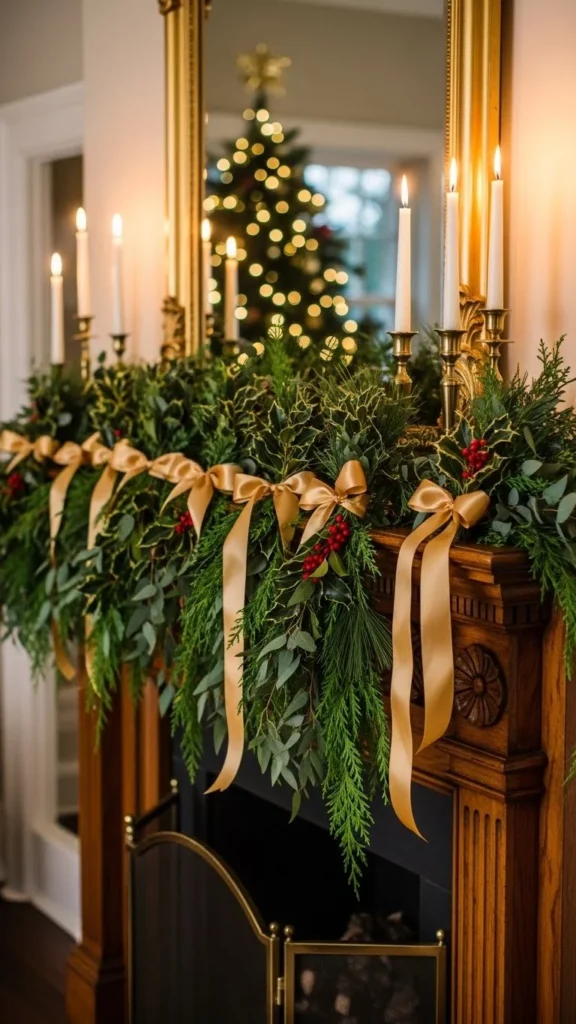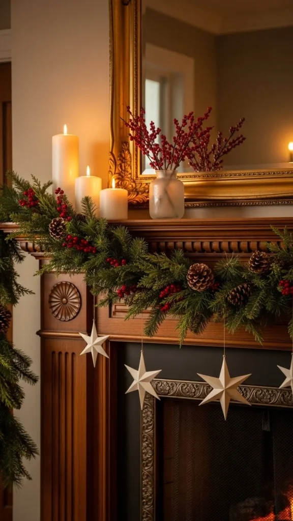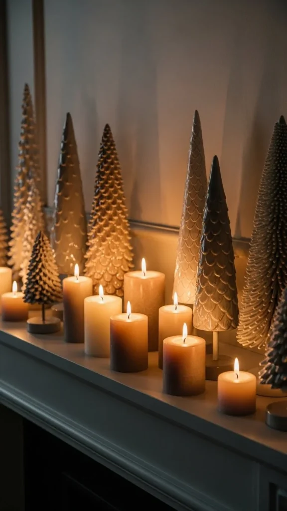 A mirror above the mantel reflects candlelight and tree lights at night. This doubles the glow without adding more decor.