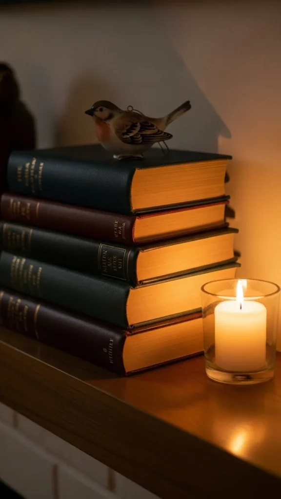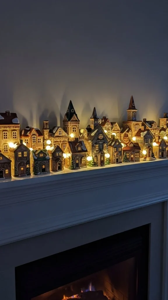 A few small ceramic houses add charm without crowding the mantel. Place two on one side and one on the other for soft balance.