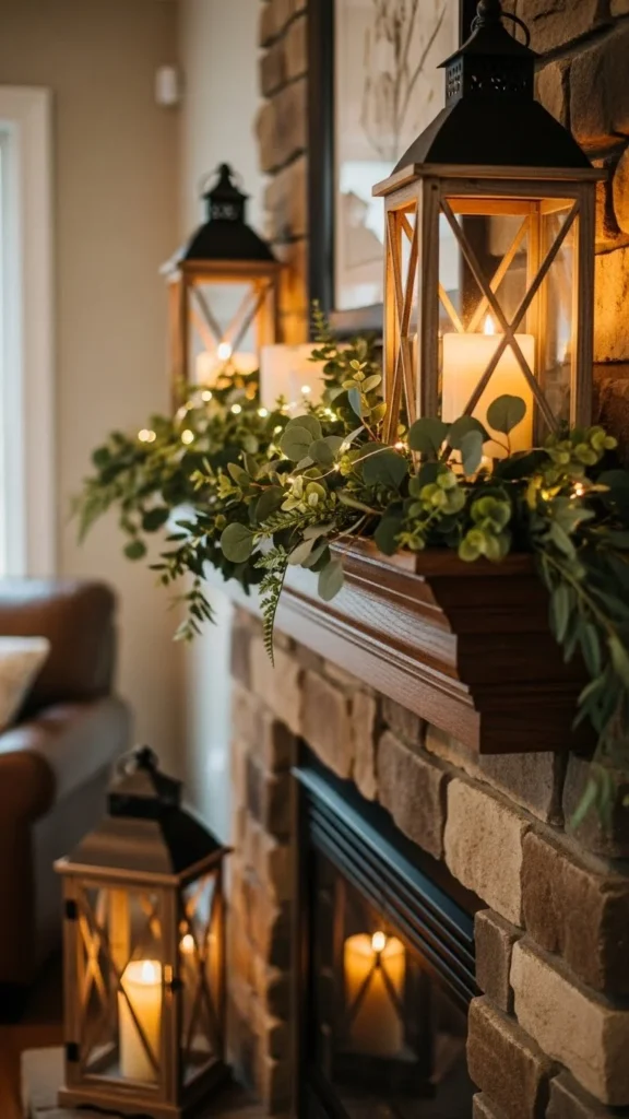 Lanterns placed on each end of the mantel give structure to the layout.