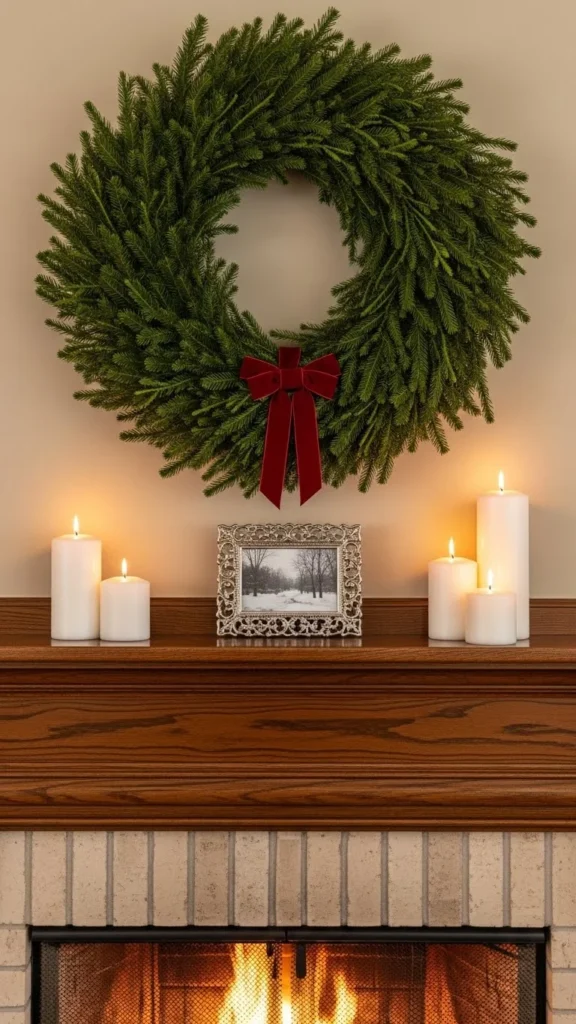 One wreath can carry the whole mantel. Place it centered above the fireplace for a balanced look. Keep the rest of the decor light so the wreath remains the focus.