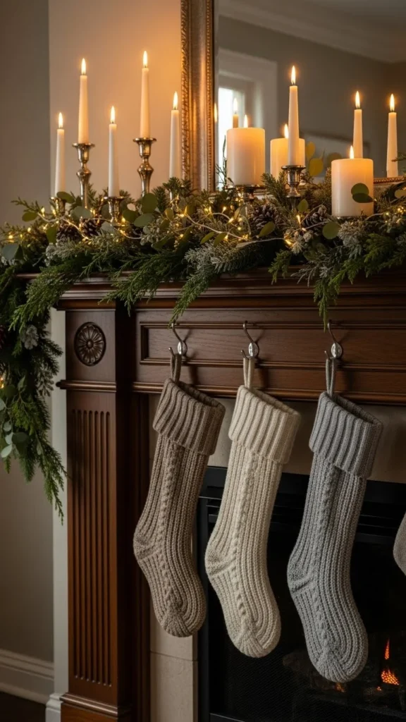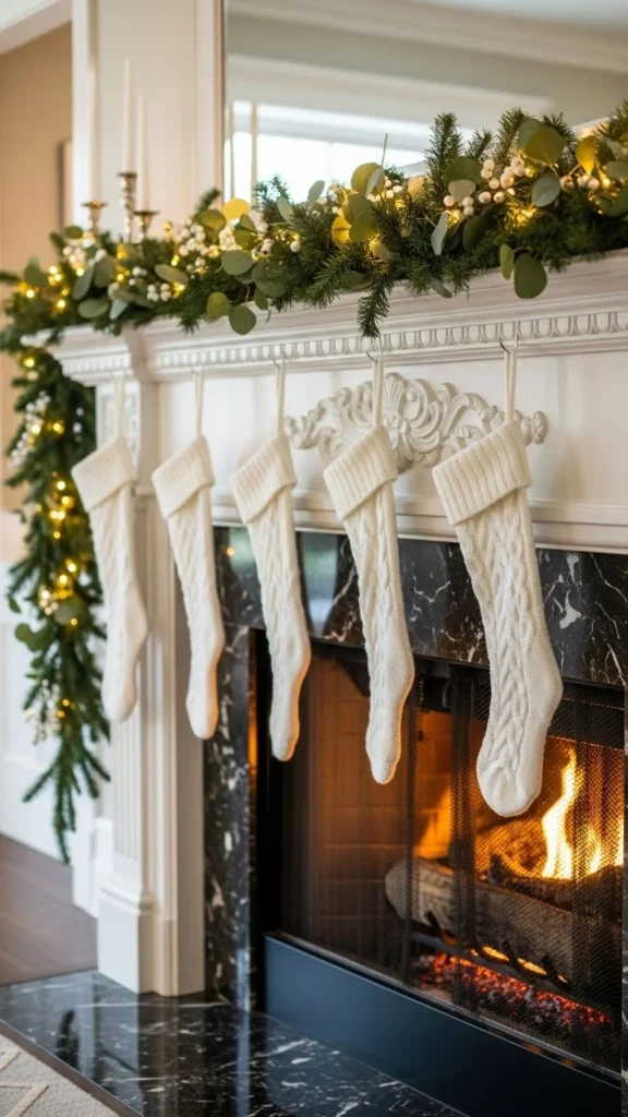 Stockings instantly signal the season. Use matching colors or similar textures for a tidy look. Hang them evenly with simple hooks.
