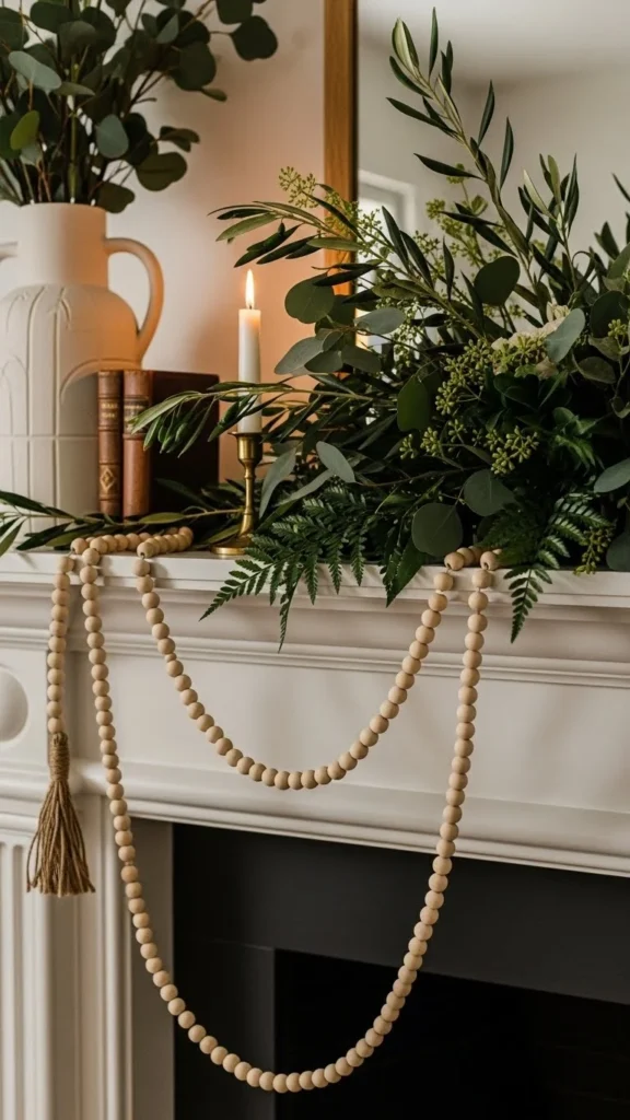 Wooden bead garlands add warmth and texture. Drape one across the front of the mantel or loop it around candles.