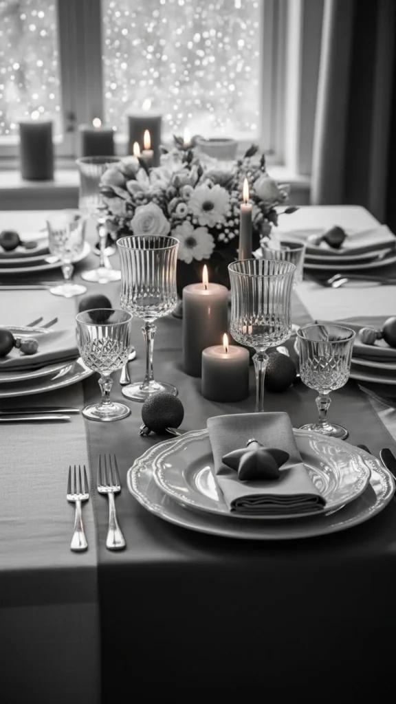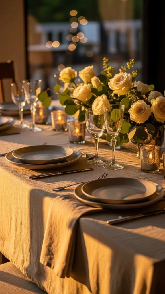 A neutral linen tablecloth sets a calm base for New Year dinners. Linen adds texture without demanding attention. Beige, soft gray, or off-white shades work well with candles and metallic accents.