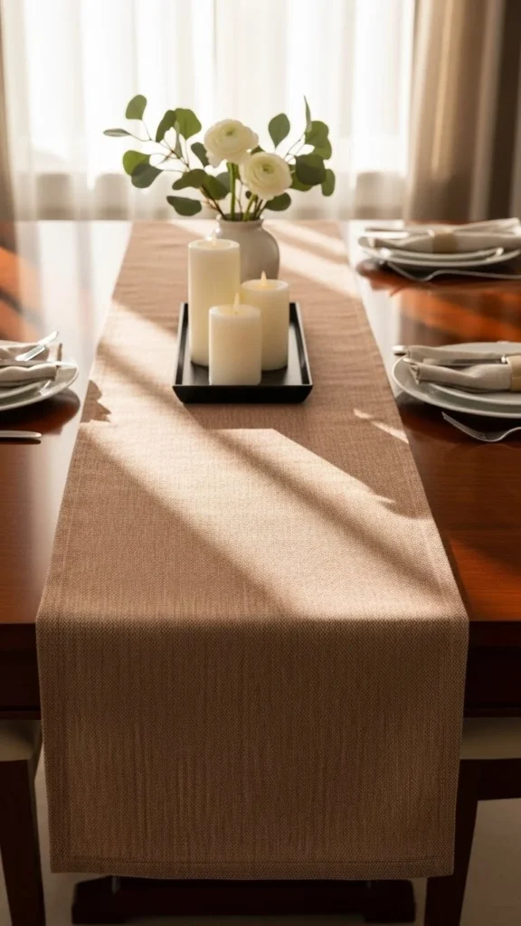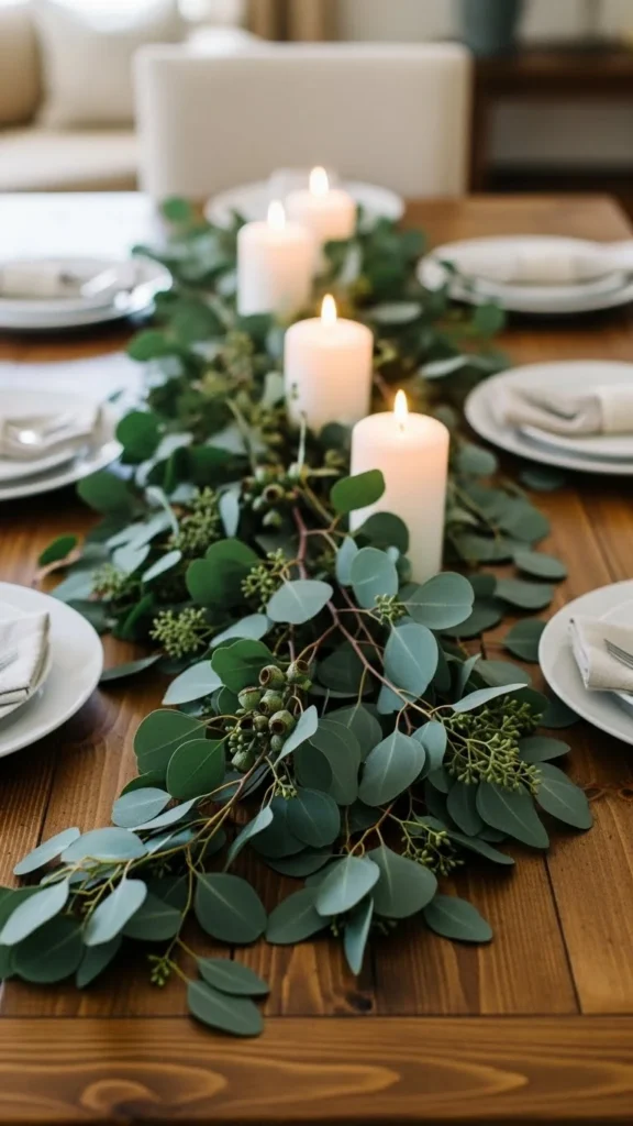 A greenery runner adds life without cost. Eucalyptus, olive branches, or faux greenery all work well.