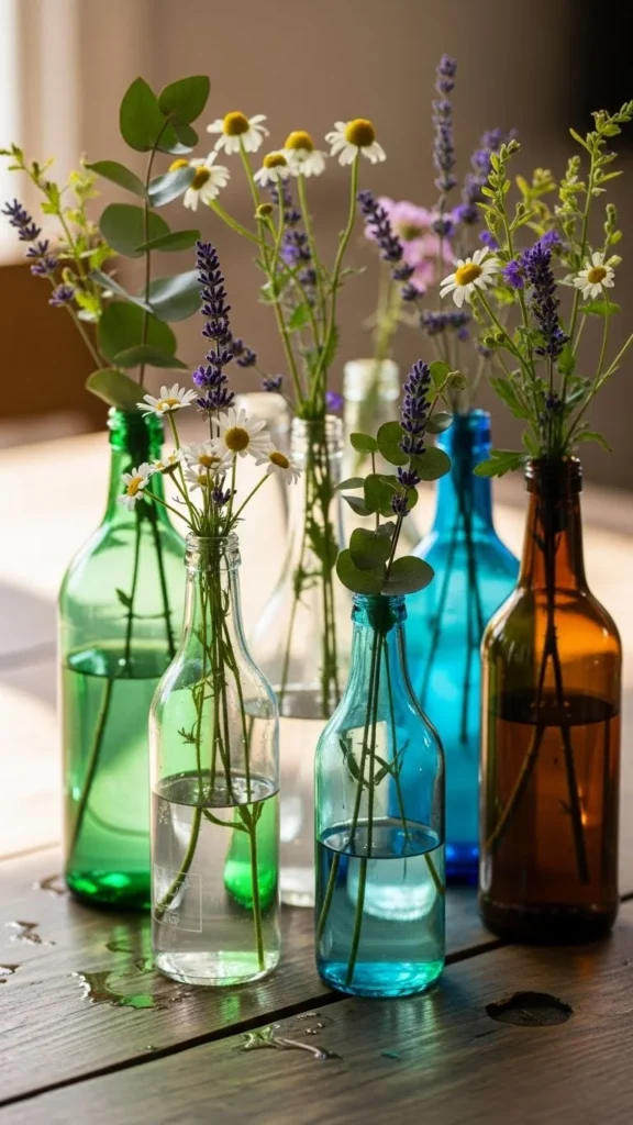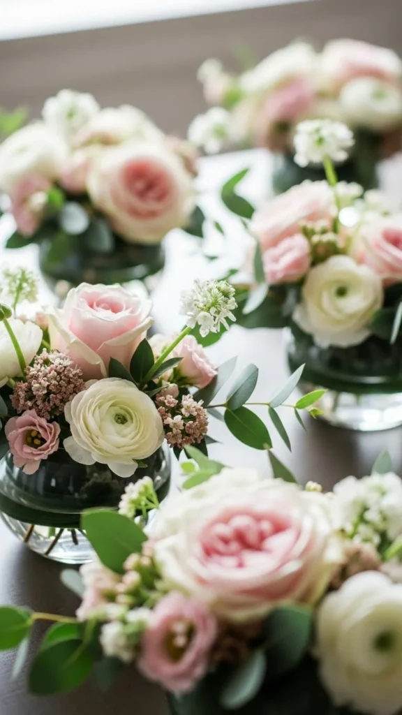 Repurpose jars or bowls instead of vases. Stick to neutral or seasonal blooms.