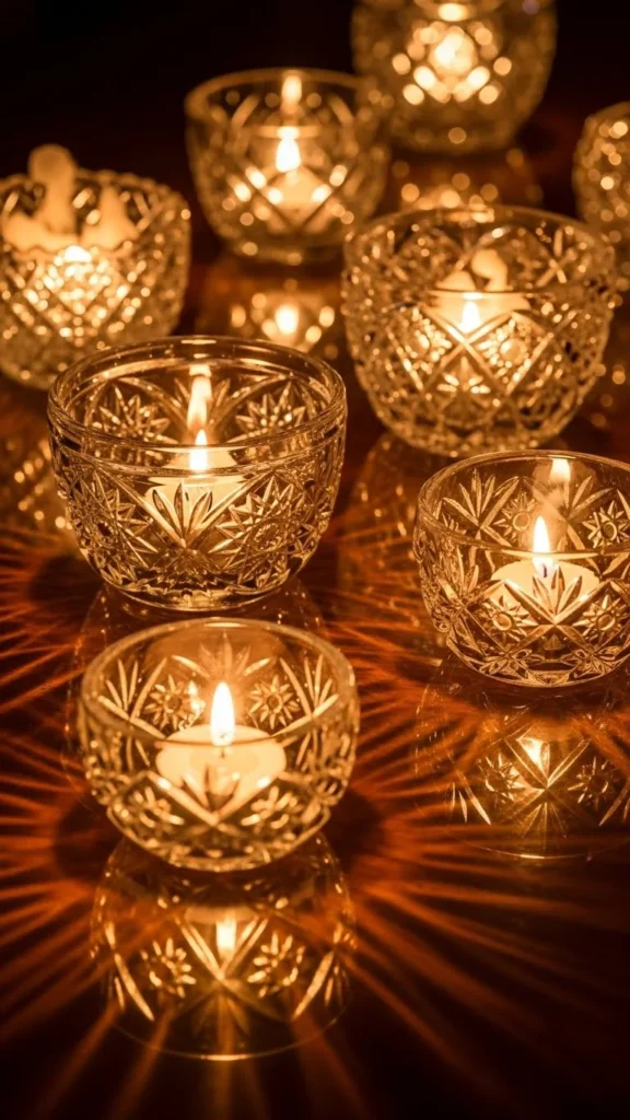 Cut glass reflects light subtly. Use bowls or candle holders.