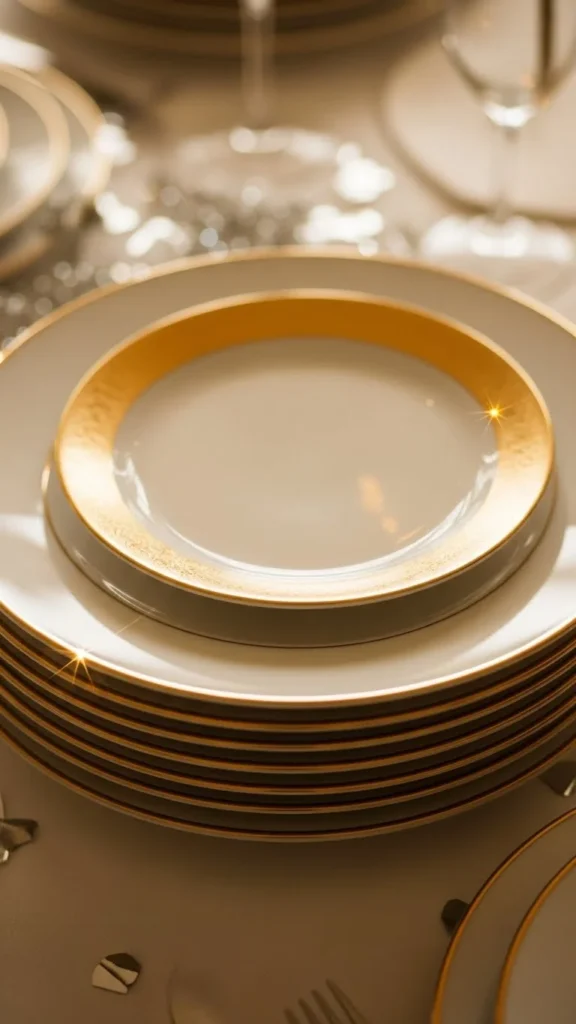 Gold rim plates bring a formal feel even to simple meals. If you don’t own a full set, mix them with plain white plates.