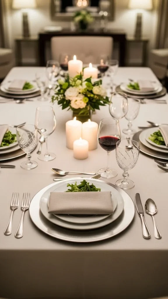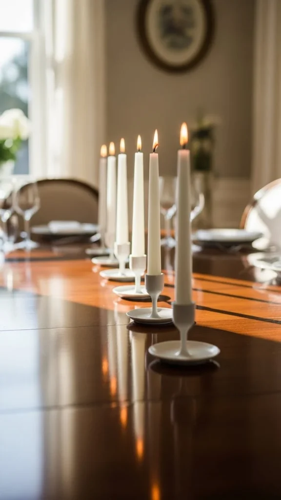 Candles create a welcoming atmosphere during meals. Slim candlesticks work well because they do not crowd the table. Choose holders in glass or metal for easy styling.