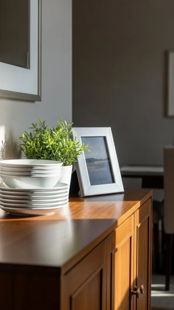 Sideboards offer extra storage and display space. Style them with items you already own. Stack plates, add a small plant, and include one framed photo.