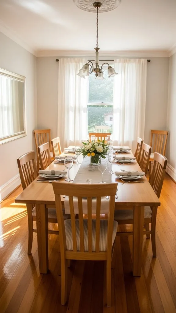 Another budget idea is adding simple seat cushions in neutral fabric. This refreshes seating without buying new furniture. Wood tones work well with many table styles and help the room feel cohesive. Guests often comment on comfortable seating, so cushions or chair pads can make a big difference during longer meals.