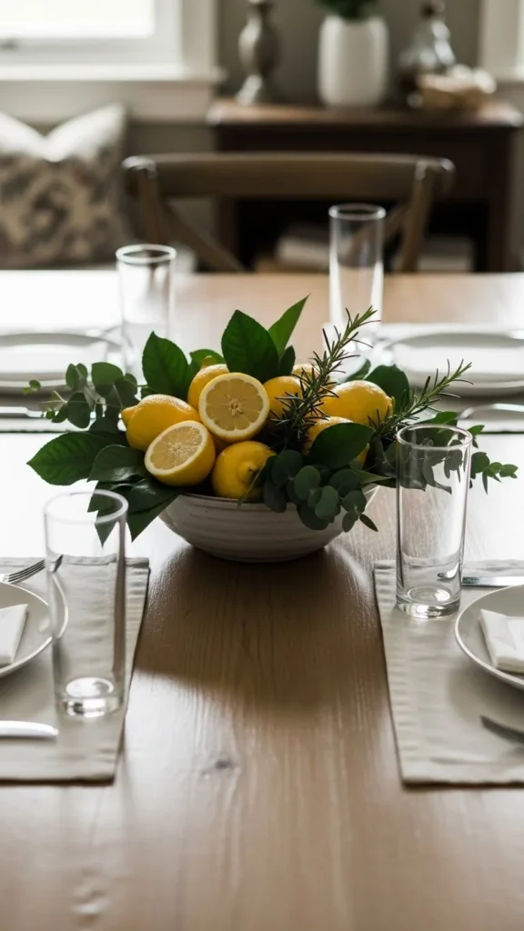 A bowl filled with fruit or greenery works as an easy centerpiece. Lemons, apples, or faux greenery all work. Choose shallow bowls so the table remains functional.