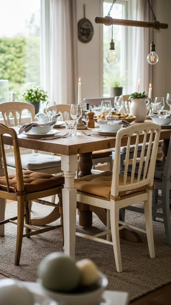 Mixing chair styles adds character to dining rooms. Keep colors similar to maintain balance. This approach works well if you collect chairs over time.