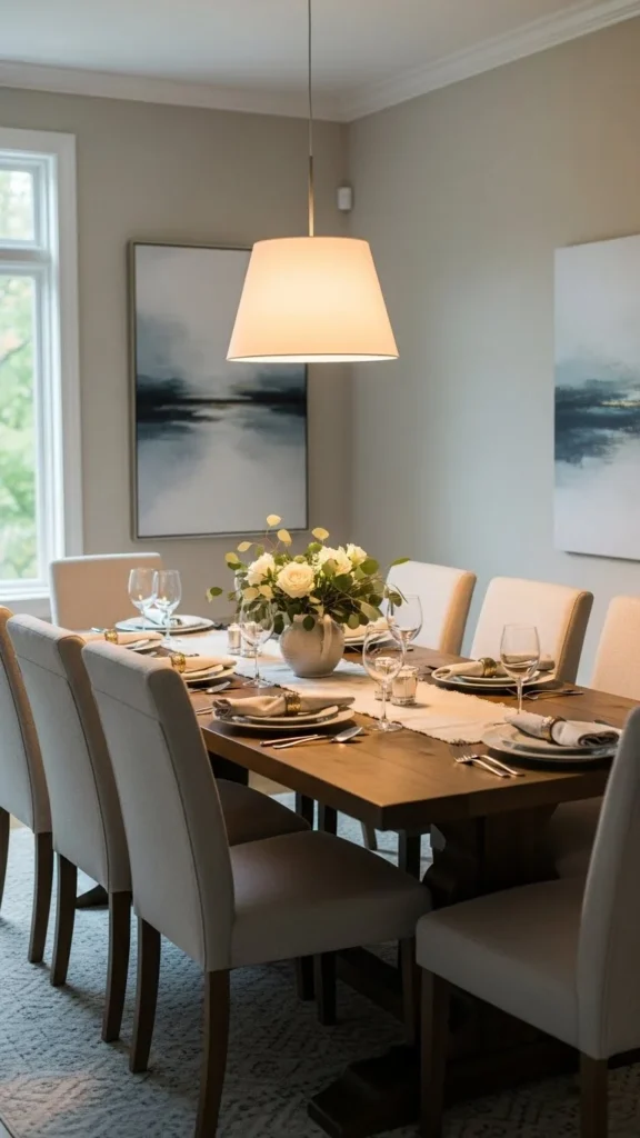 Lighting affects how meals feel. A soft pendant light above the table helps create a welcoming setting. Choose warm bulbs for comfort.