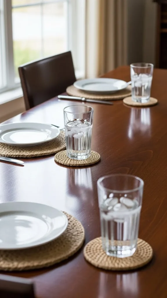 Coasters protect surfaces while adding a finished touch. Choose materials like cork, wood, or stone. Keep colors neutral.