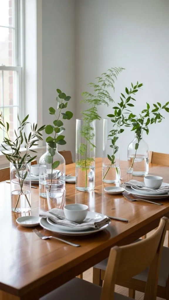 Clear glass vases bring a light, open feel to the dining table. They allow greenery to stand out while keeping the overall look balanced. You can use inexpensive bud vases or recycled jars cleaned and filled with water. Cut branches from your yard or grocery store greens work well here.