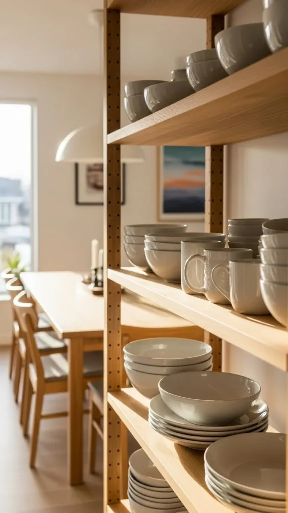 Open shelves allow you to display everyday dishes. Keep items grouped by color or size. This keeps the look tidy.