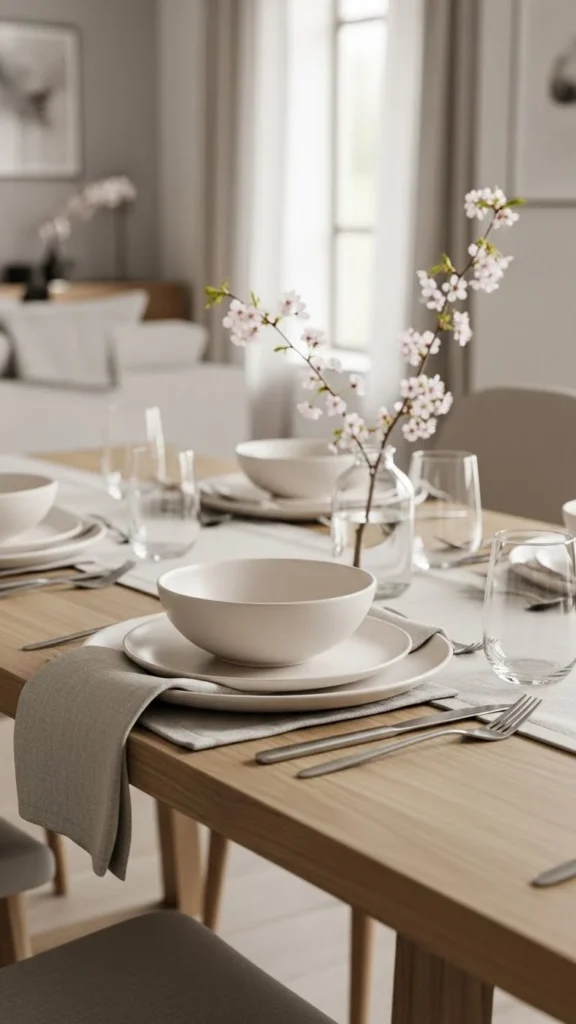 Ceramic dishes in light shades give dining rooms a grounded and welcoming feel. Matte finishes work especially well in spring because they soften reflections and keep the table from feeling busy. You do not need a full matching set. Mixing similar tones creates a relaxed but thoughtful look.