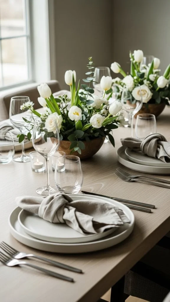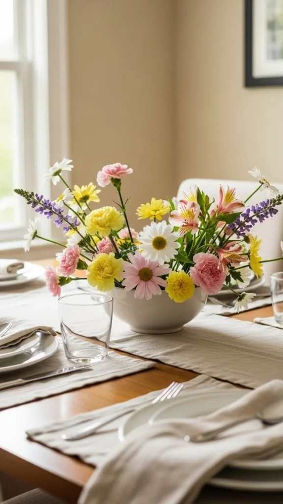 This approach costs less than large bouquets and allows conversation across the table. Choose soft spring colors like pale yellow or light pink. You can reuse bowls you already own. When flowers fade, replace them with greenery or branches. Guests appreciate flowers that do not block views or feel overwhelming. This style suits both casual lunches and planned dinners.