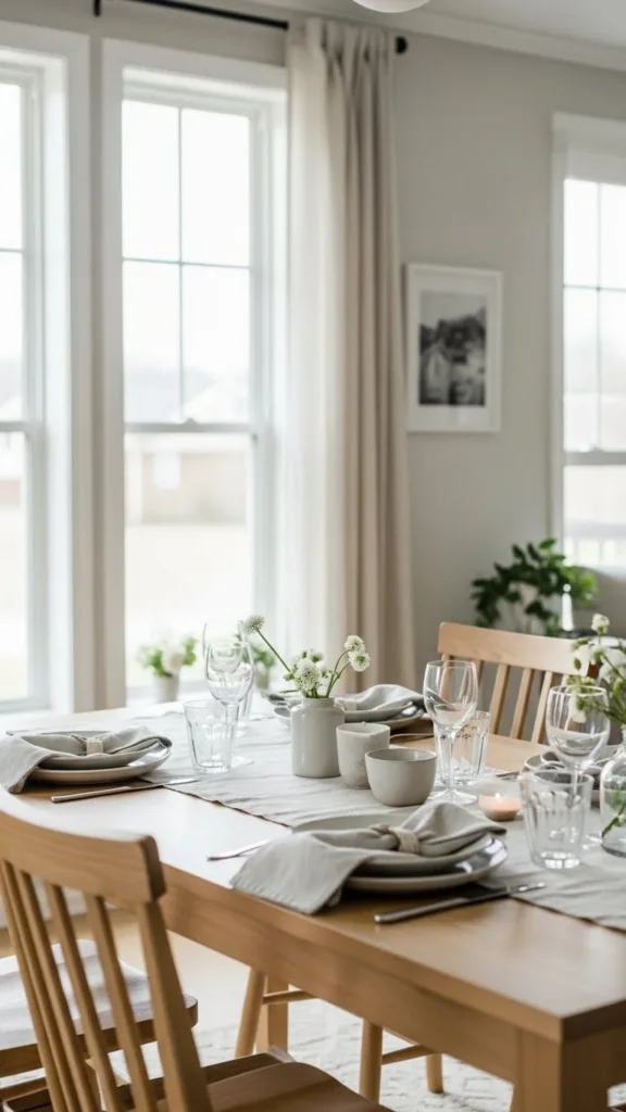 Layering helps too. Place a slim runner across the center to add interest while keeping the table simple. White linens also make dishware and centerpieces more noticeable without competing for attention. This setup works for both everyday meals and guest dinners. When guests arrive, the table already looks styled without extra effort. Keeping linens neutral also lets you reuse them year-round with different accents.