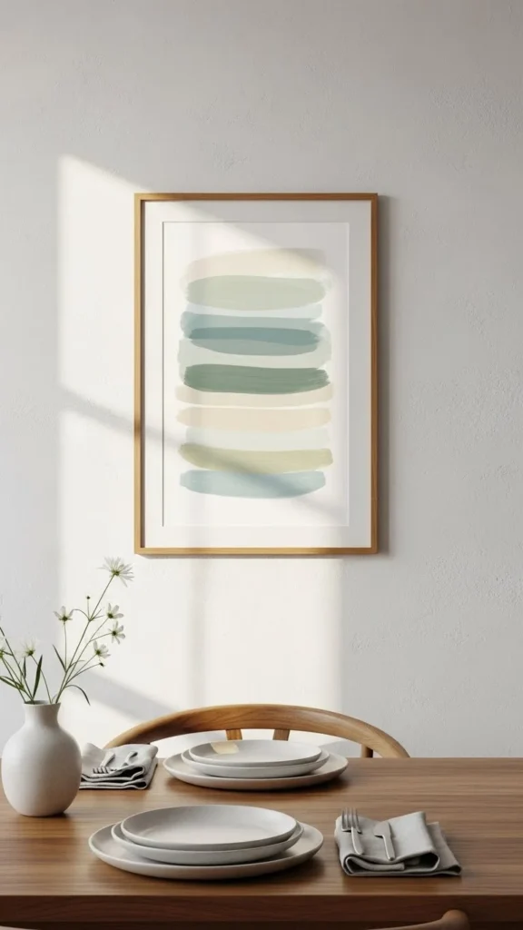 One simple art piece on the dining room wall can shift the entire mood. Choose artwork with soft colors or nature themes. Frames in wood or black keep things grounded.
