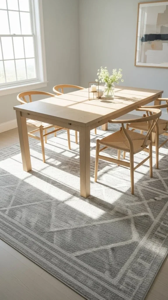 A neutral rug under the dining table helps define the space. Choose low-pile options for easier cleaning. Light patterns hide crumbs better than solid colors.