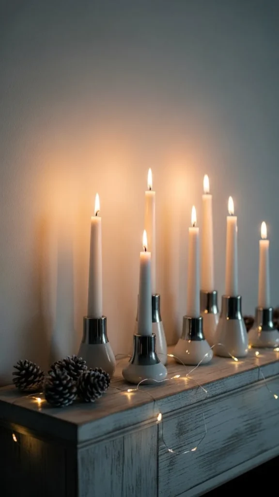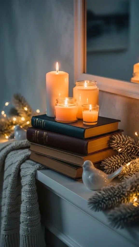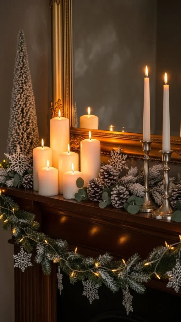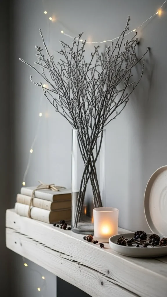 Candles remain a winter staple for mantel styling. Use a mix of tall and short candles to create gentle height changes. Stick to one color family, such as white or soft ivory, to keep the look calm. Simple holders made of wood, metal, or ceramic work well.