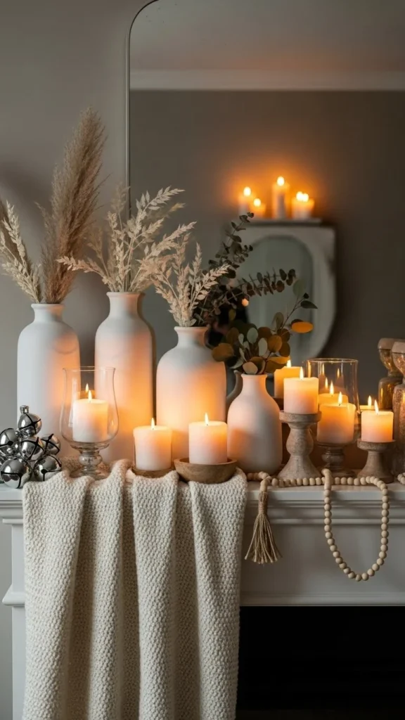 Height variation keeps the mantel visually interesting. Combine tall candles, mid-sized vases, and low objects.