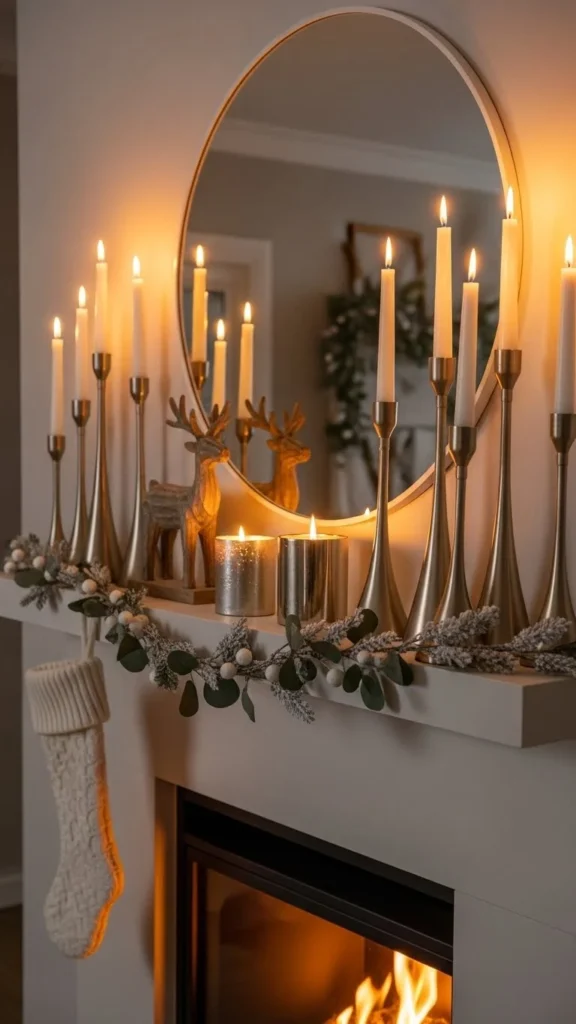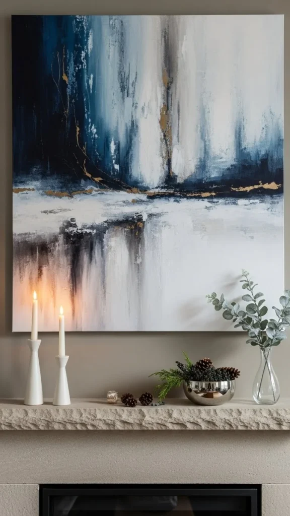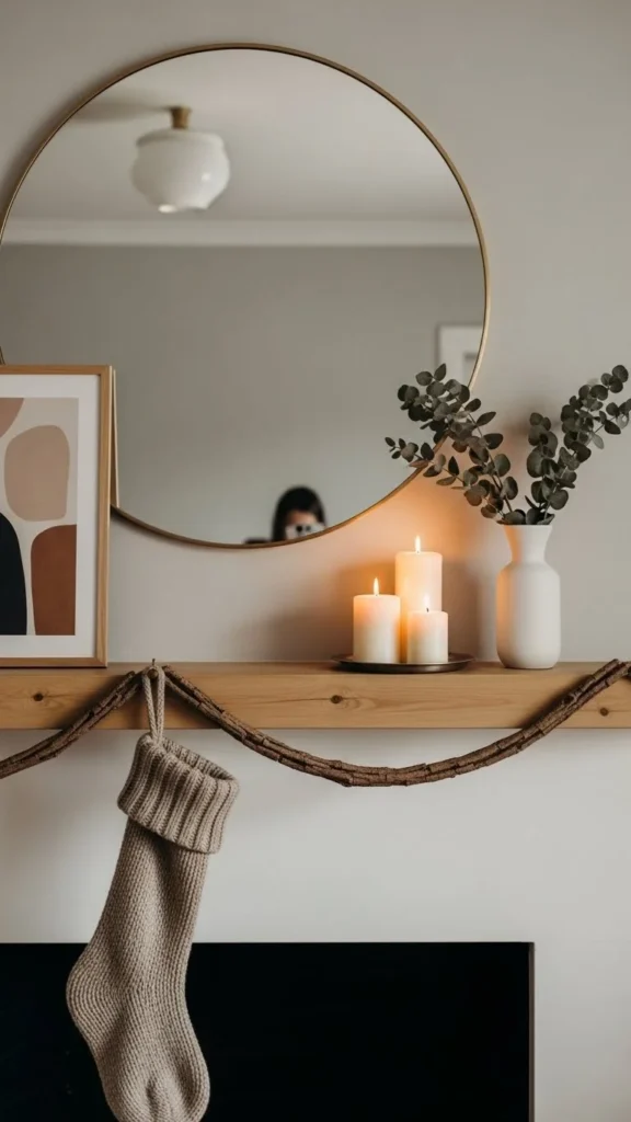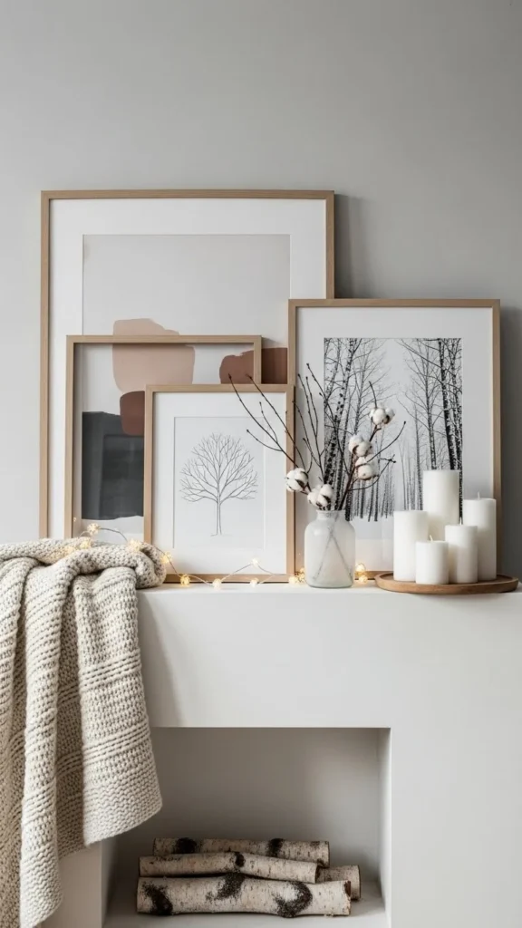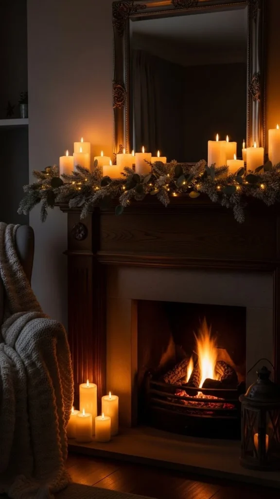 A large mirror above the mantel creates balance and light. It reflects candle glow and makes the room feel open during darker months. Choose a simple frame in wood or metal for winter warmth.