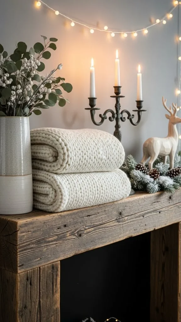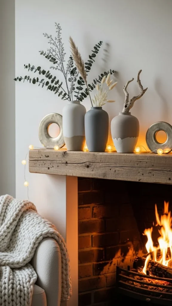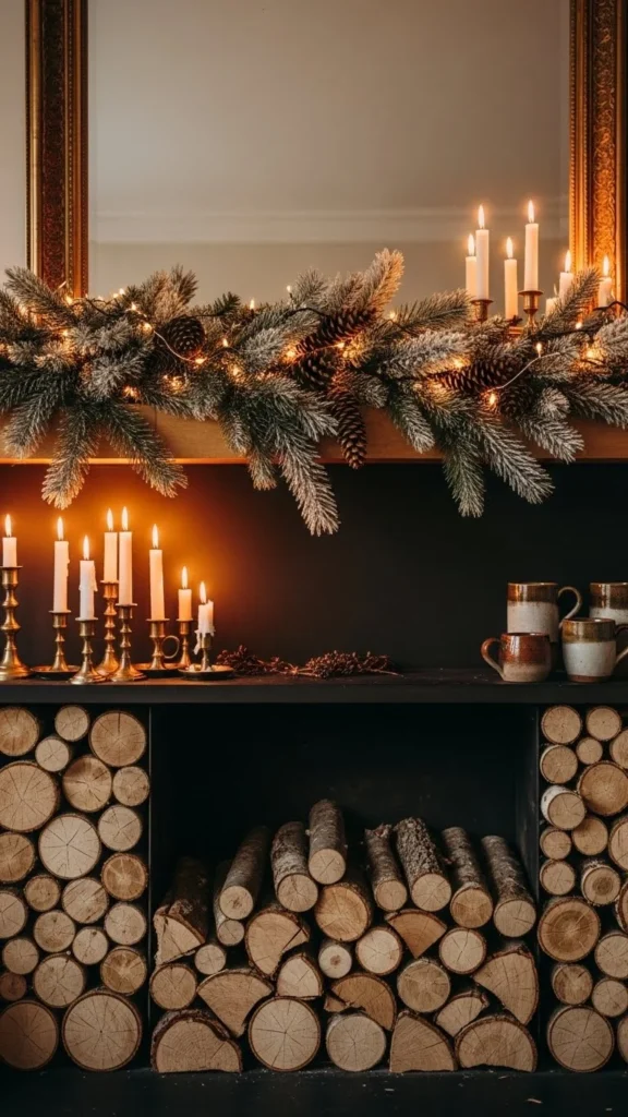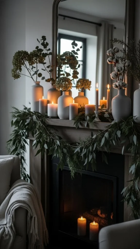 Greenery adds life during winter months. A eucalyptus or faux pine garland draped loosely across the mantel brings softness. Let it dip naturally rather than forcing symmetry.