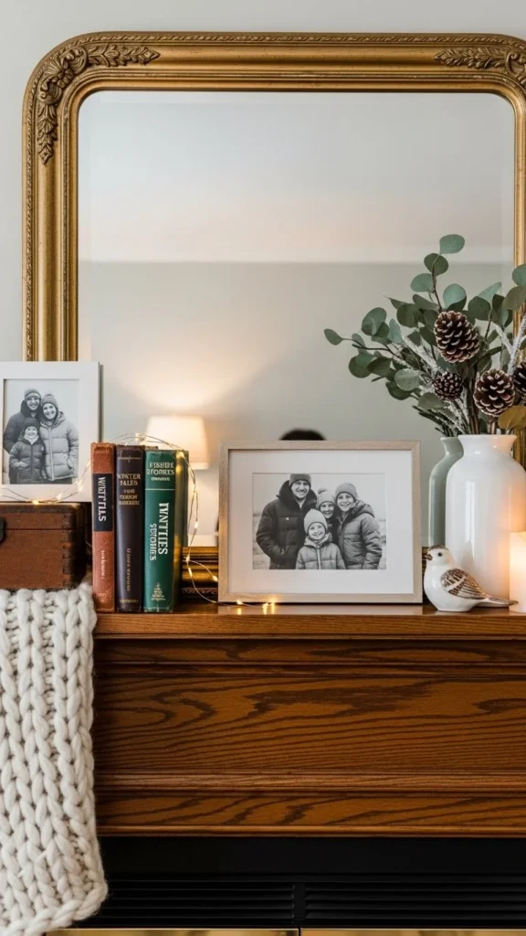 Personal items make the mantel feel real. A small photo, book, or keepsake works well.
